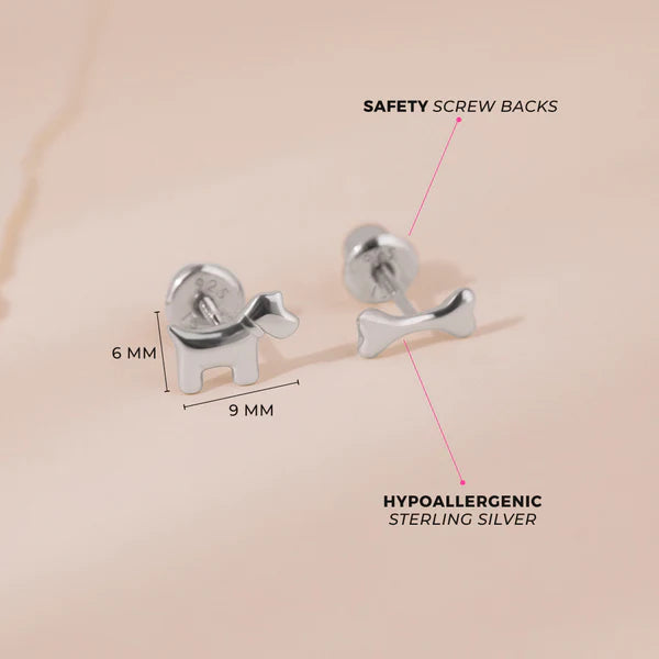 The most adorable pair of doggy themed screw back earrings for little girls. Such a cute pair of mixed-match dog and bone earrings that your sweet little girl will love to wear. If your sweet little girl's best friend is her furry friend at home, these are the ideal earrings for her. Polished earrings created from 925 sterling silver, these earrings are hypoallergenic and safe for sensitive skin. These fun earrings include safety screw backs that allow the earrings to remain safely in place.