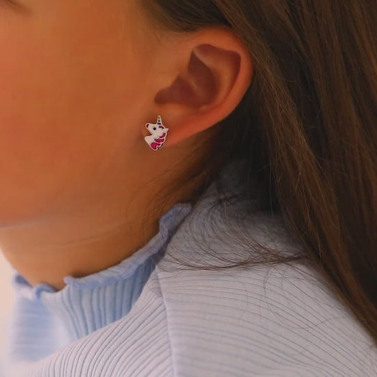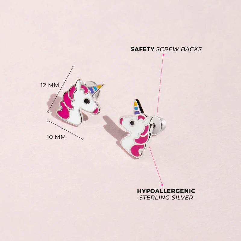 Searching for a delightful unicorn-themed jewelry present for your young girl? Discover this charming pair showcasing an adorable unicorn crafted in 925 sterling silver— for sensitive ears—and adorned with vibrant multicolor enamels. These girls' unicorn earrings come with a screw back safety fastening for enhanced comfort and security. Secure a pair of these sweet unicorn earrings today, and we'll beautifully package them in their own little Window Box.